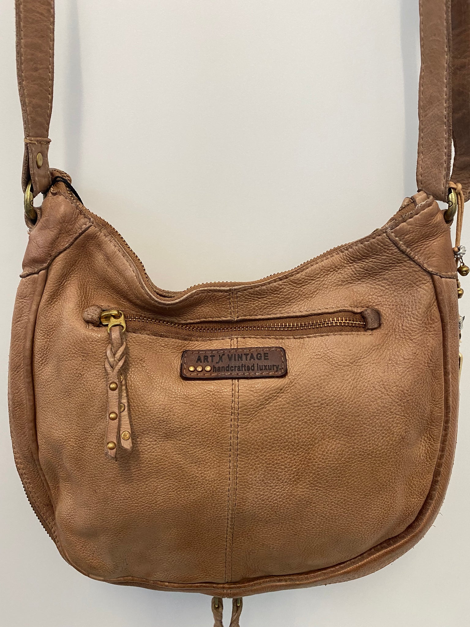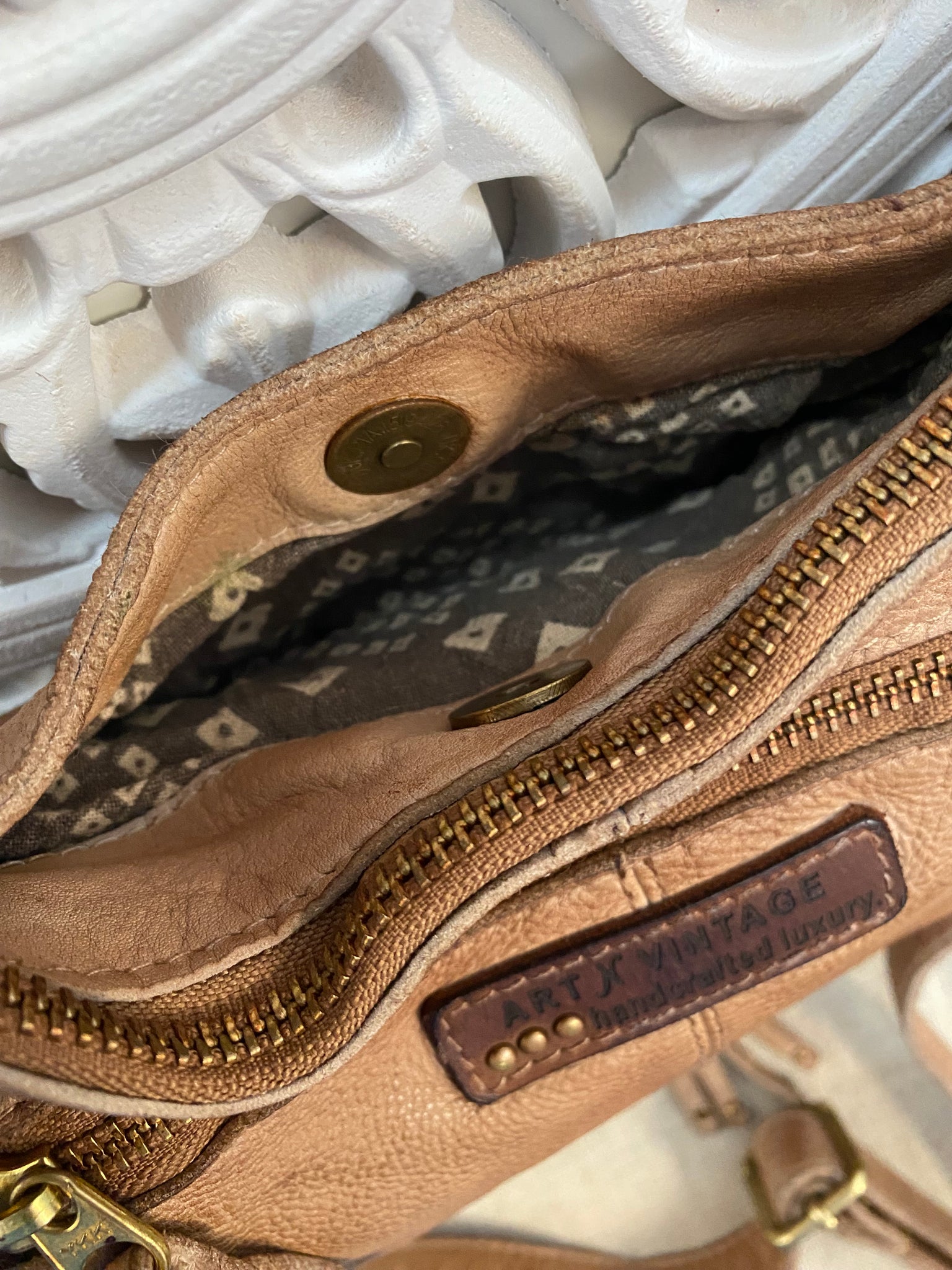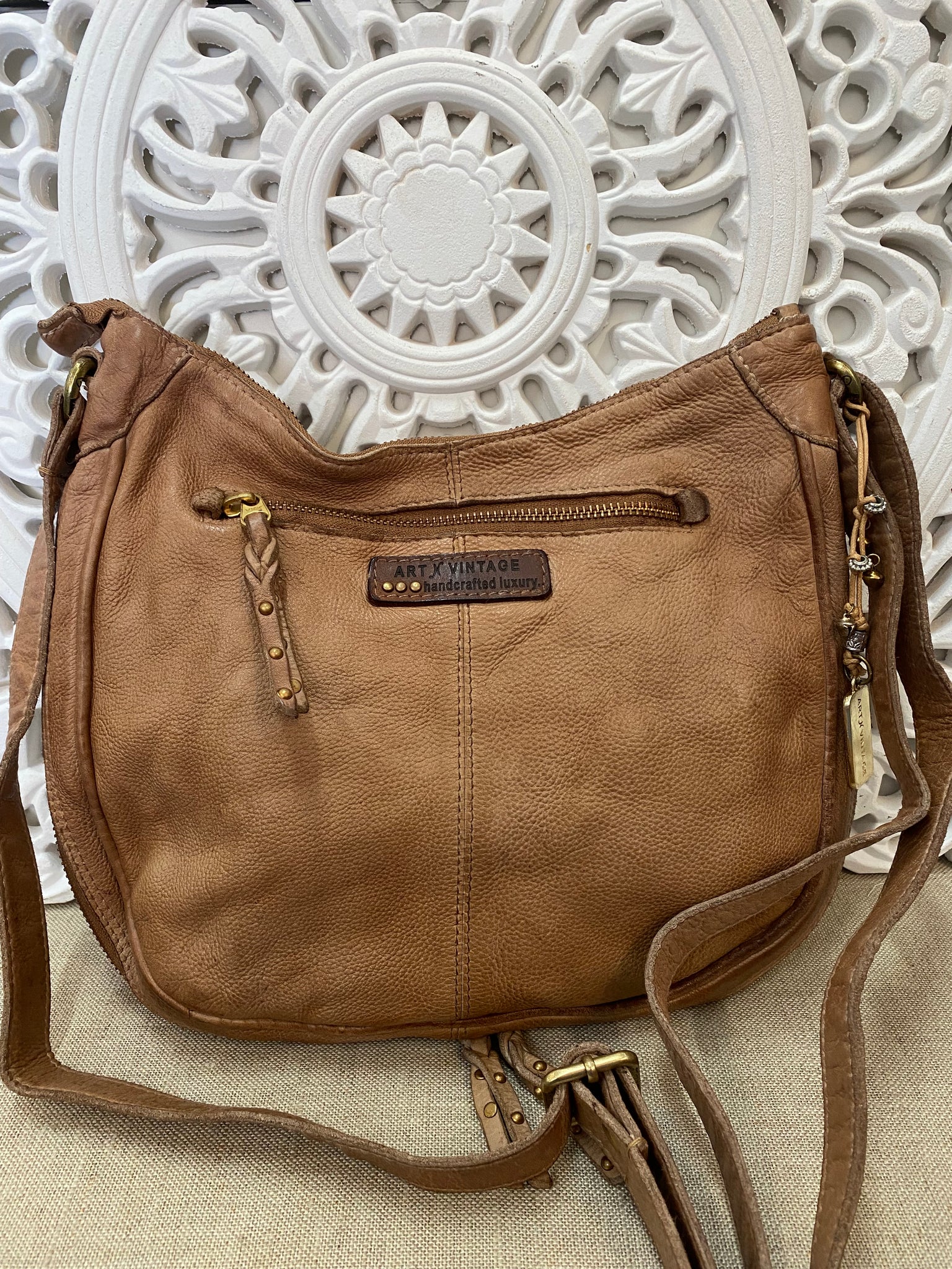 Meet your new everyday essential — the Carrera Zip Round Bag in Taupe, crafted by Art N Vintage and beautifully detailed with an intricate mandala design, bronze accents, and hand-stitched finishing. Made from premium white raw leather that’s dip-dyed, tumbled, and treated for a naturally weathered look, this timeless piece only gets softer and better with age.