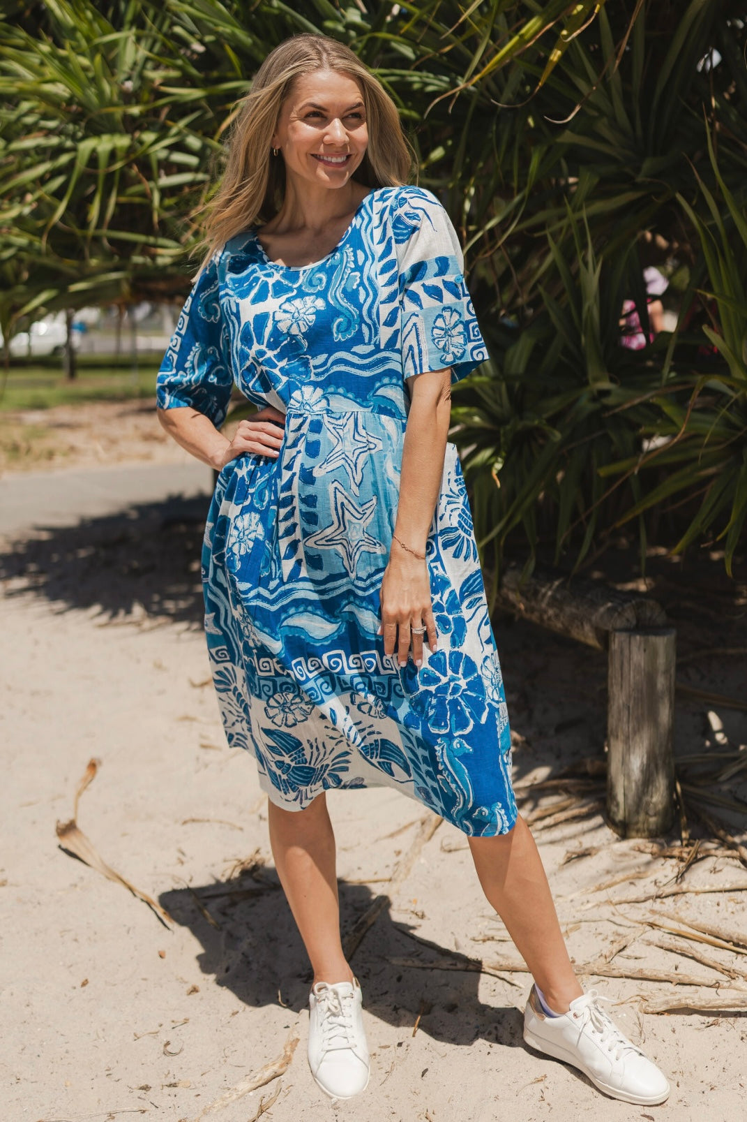 Step into effortless summer elegance with the Yvonne Dress in MonoSea Blue. Crafted from 100% breathable cotton slub, this below-the-knee dress blends comfort with timeless style. The relaxed silhouette, round neckline, and elbow length sleeves make it perfect for warm days, while the fresh hue and subtle print detail bring a touch of seasonal charm. With in-built pockets, it’s as practical as it is pretty—your new go-to for everyday wear or casual outings.