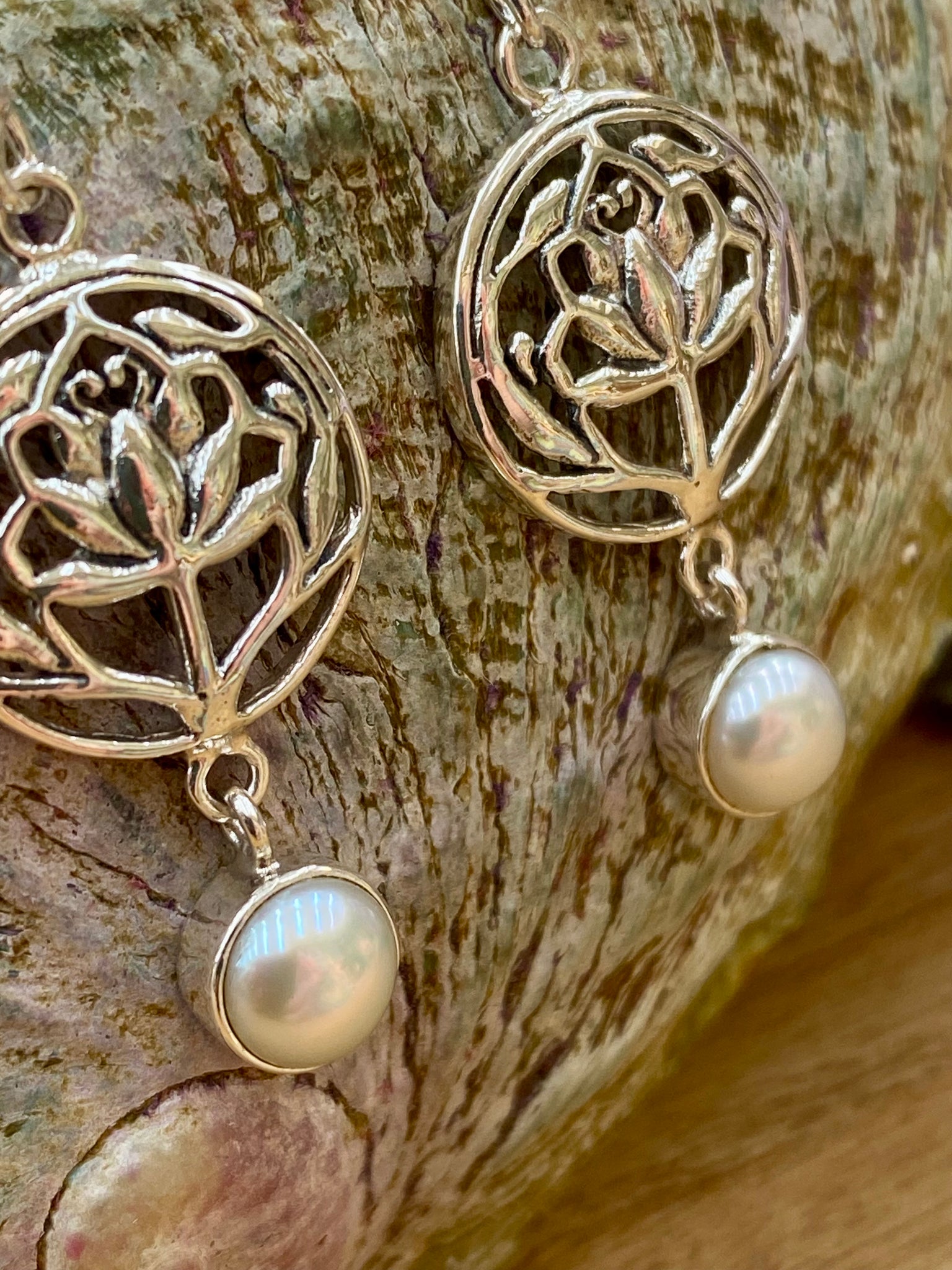 Elegant, feminine and beautifully symbolic, these Sterling Silver Water Lily Drop Earrings bring Art Deco charm to your everyday style. Each earring features a delicately crafted water lily set within a 15mm round frame, finished with a soft 6mm pearl that adds movement and grace.