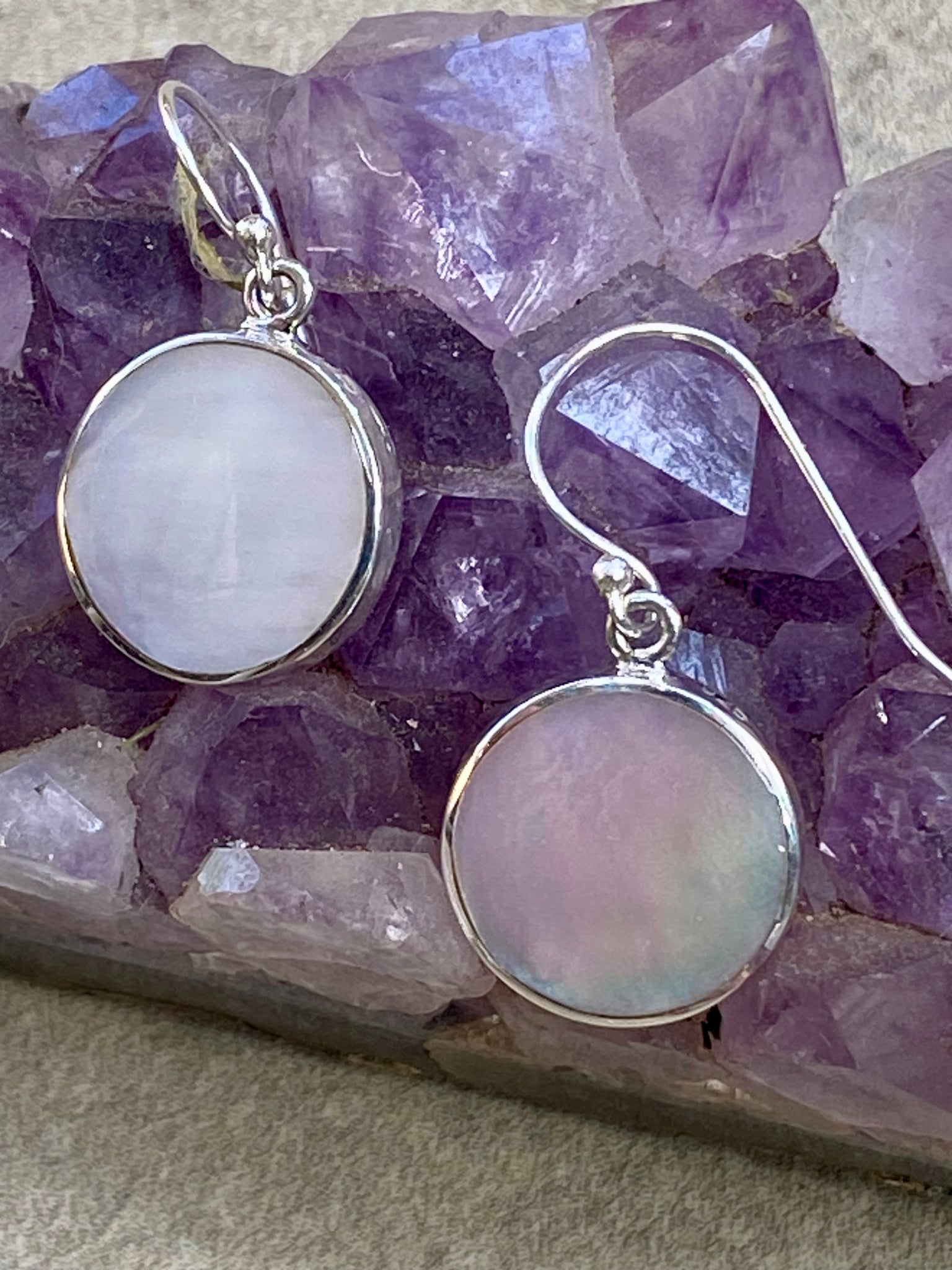 Enjoy the magic of versatility with these Two-Sided Mother of Pearl Drop Earrings, beautifully handcrafted in sterling silver. Each 20mm round earring features pink mother of pearl on one side and white mother of pearl on the other, giving you two stunning looks in one effortless piece.
