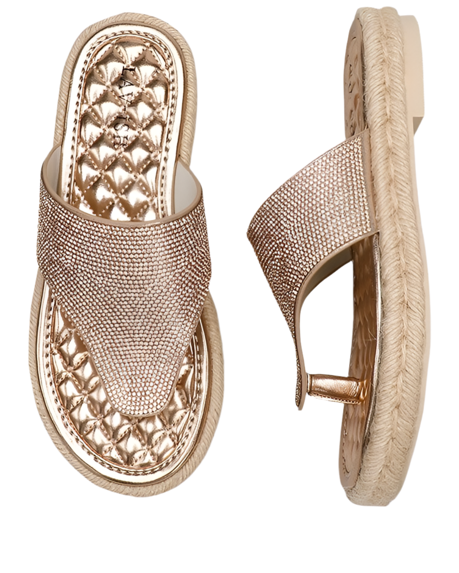 Add a little sparkle to your step with the LAV-ish Rose Gold Bling Sandals—where casual comfort meets glam style. Featuring a shimmering rose gold finish and a unique hemp rope-wrapped heel, these sandals are perfect for sunny days, seaside strolls, or relaxed summer evenings.