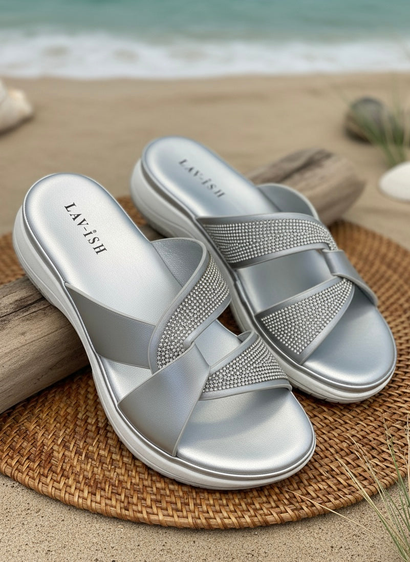 Step into comfort and shimmer with the LAV-ish Skye Suede Slides. Designed with soft crossover straps encrusted in crystal bling and a cushioned innersole, these silver slides bring effortless glamour to your everyday style. Whether you’re running errands or relaxing with friends, these beauties add just the right amount of sparkle to your step.