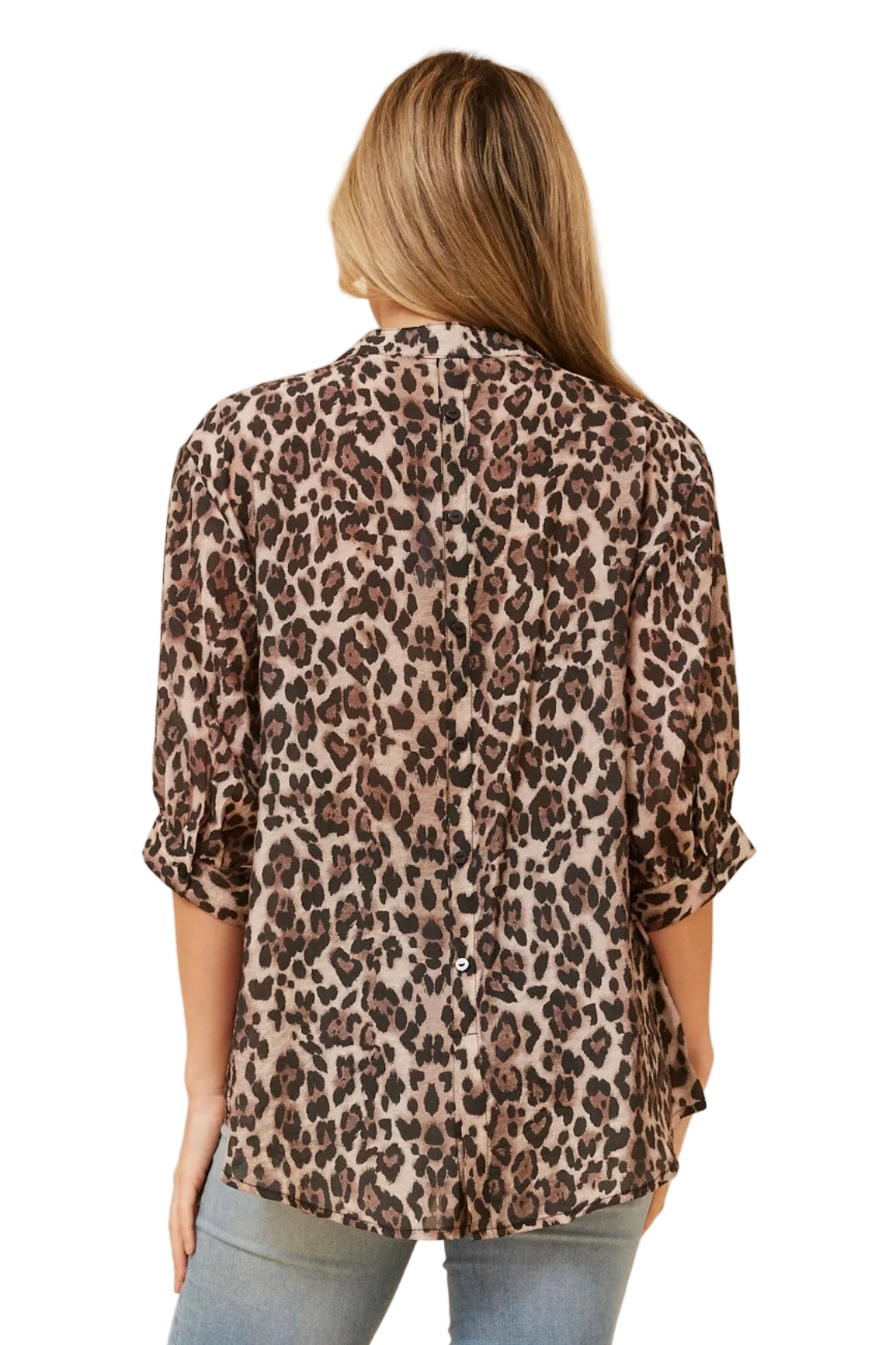 The Belinda Shirt in Chocolate Animal Print is the perfect mix of effortless style and everyday comfort. Designed with a flattering mandarin collar and open V-neckline, this shirt brings a relaxed yet refined feel to your wardrobe. Its generous fit, ¾ puff sleeves, and hi-low hemline make it a versatile piece that transitions easily from casual outings to holiday escapes.
