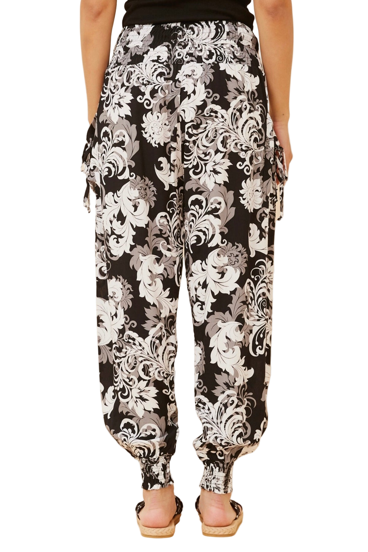 Relaxed, stylish, and effortlessly comfortable — the Harem Pants in Black/White Damask Print are your go-to for easy everyday dressing. Crafted from 100% soft viscose, these flowy pants feature a shirred elastic waistband and elasticated cuffs for that classic harem silhouette. Side pockets with tie details add a touch of boho charm, making them perfect for casual days, travel, or lounging in style.