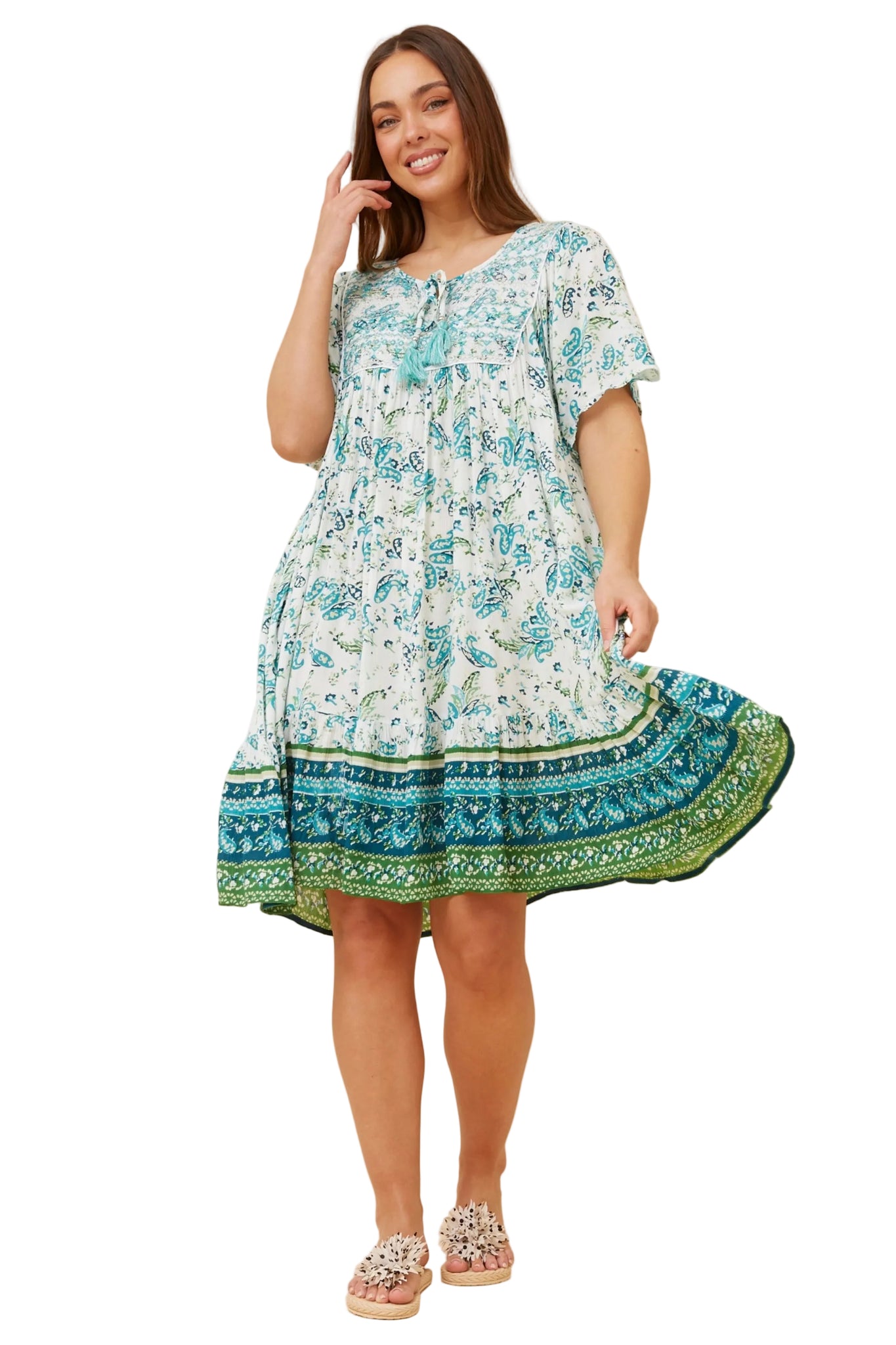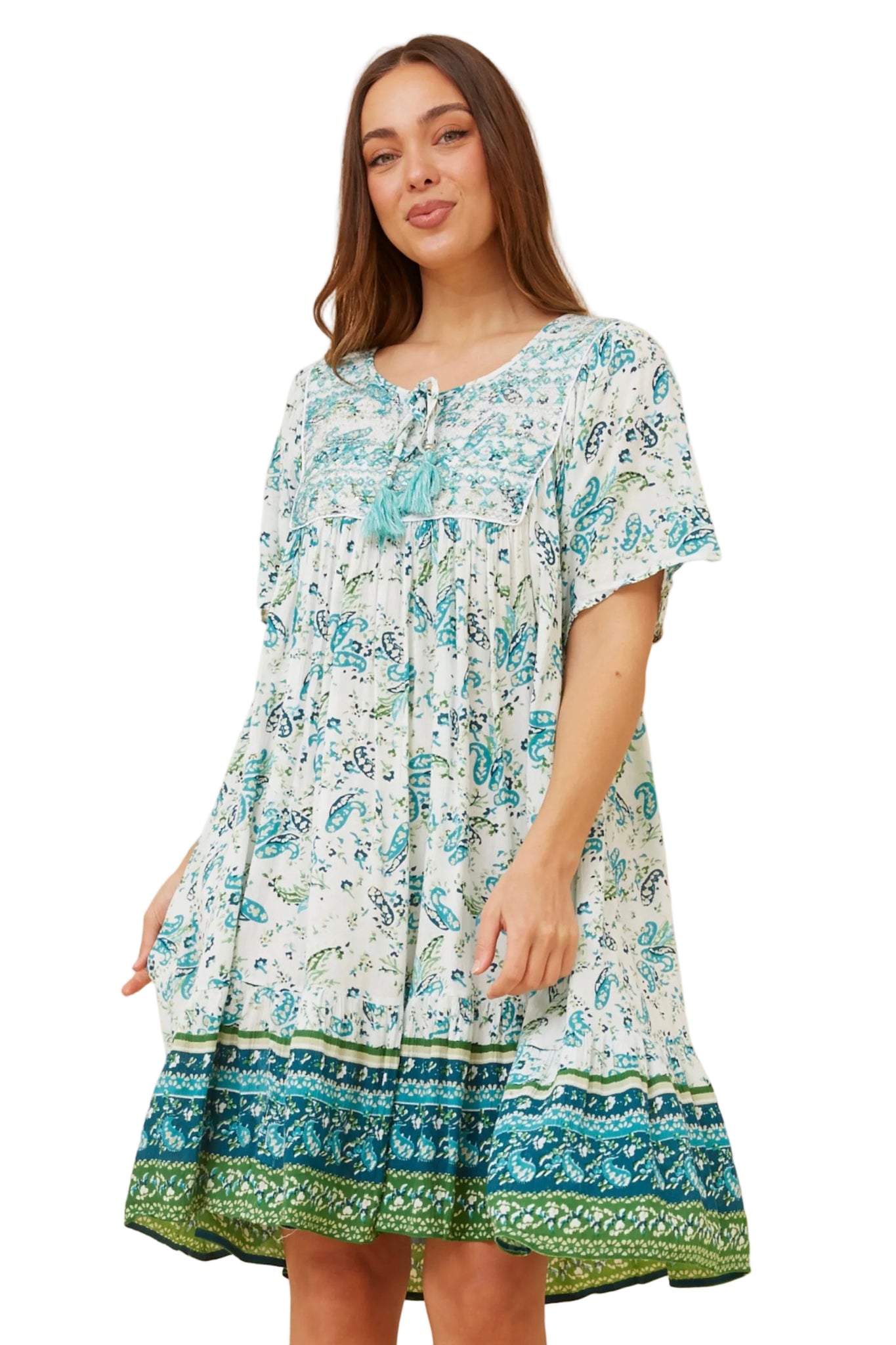 Step into effortless summer style with the Honda Boho Short Dress in Paisley Spearmint Print. Designed with a relaxed babydoll silhouette, this dress is perfect for warm days, weekend getaways, or casual outings. Featuring delicate embroidery across the chest, a round neckline with tassel tie detail, and functional side pockets, it blends comfort with boho-chic flair. The generous fit makes it flattering and easy to wear, while its breathable rayon fabric ensures all-day coolness.