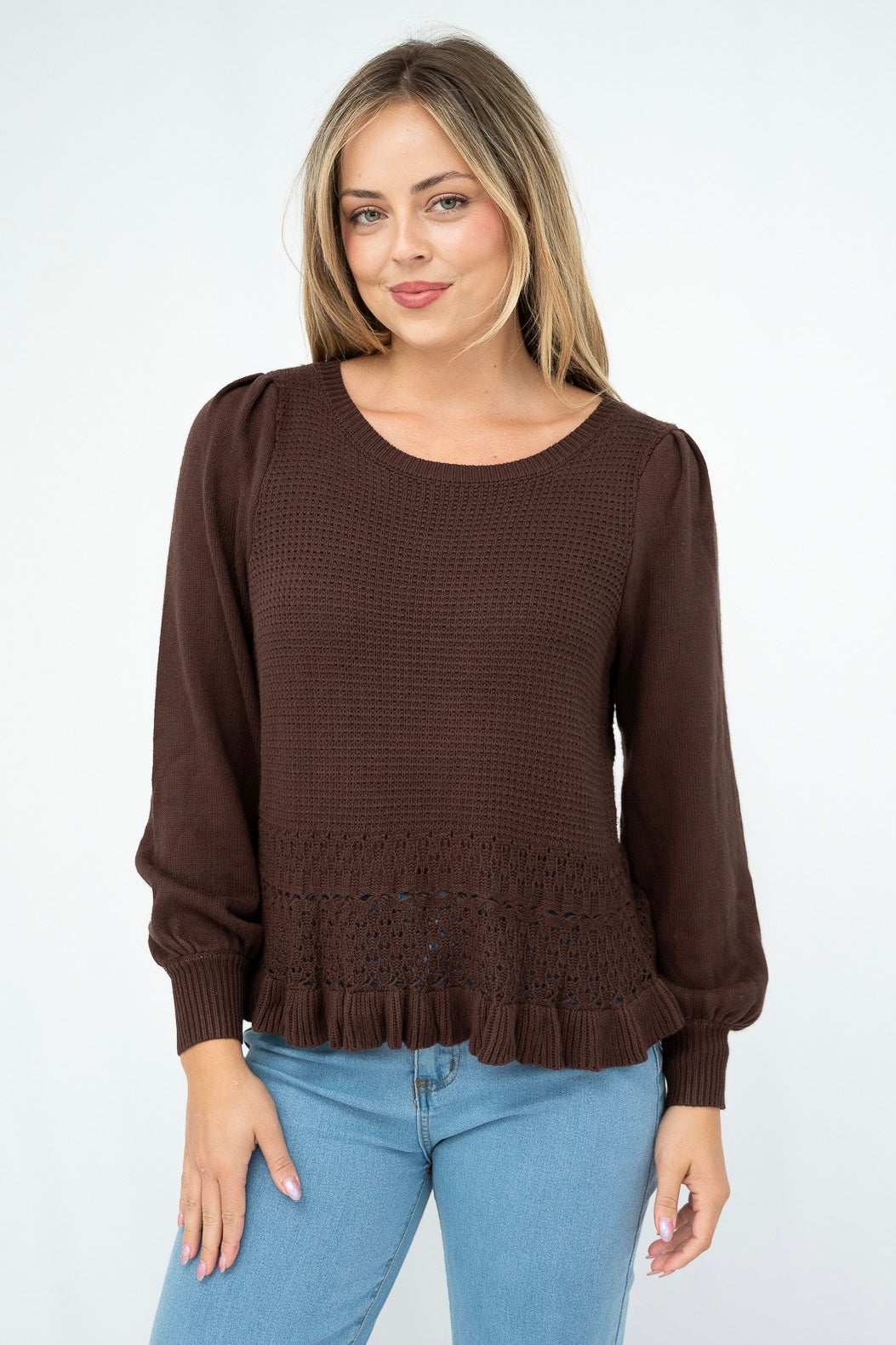 Soft, feminine and effortlessly pretty, the Lila Knit – Chocolate is the perfect blend of comfort and delicate detail. Crafted from 100% cotton, this breathable knit feels soft against the skin while offering lightweight warmth for trans-seasonal styling.
