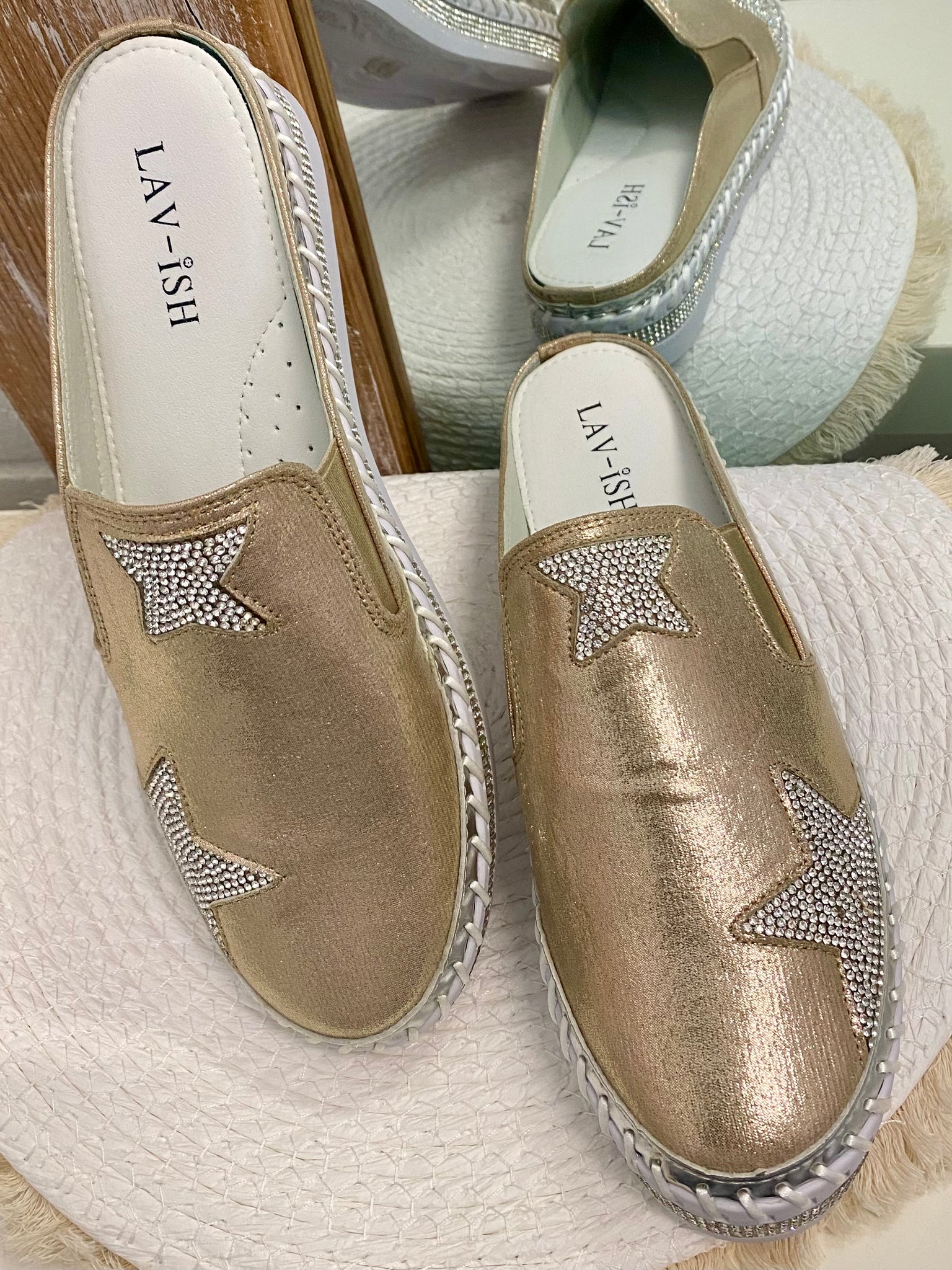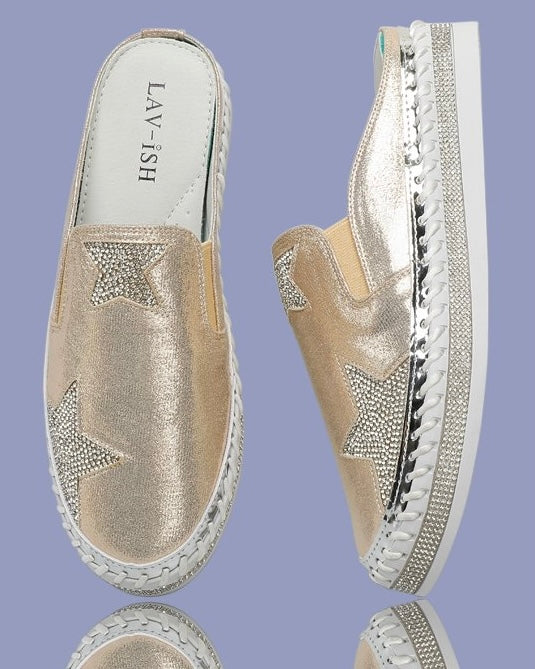 - Gold satin upper with silver bling star detail