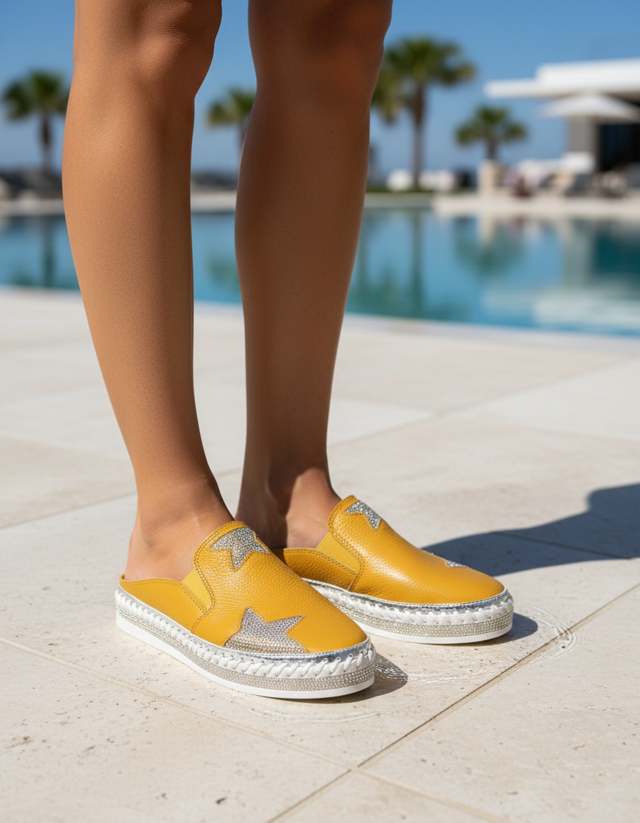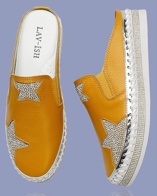 Shine bright in every step with the LAV-ish Star Bling Slides. Crafted from sleek Mustard leather and finished with a dazzling bling star, these slide s are a true statement piece. The four rows of crystals around the rubber sole add extra sparkle, while the cushioned innersole ensures you stay comfy all day long. Glamorous yet wearable—perfect for everyday chic with a touch of fun.