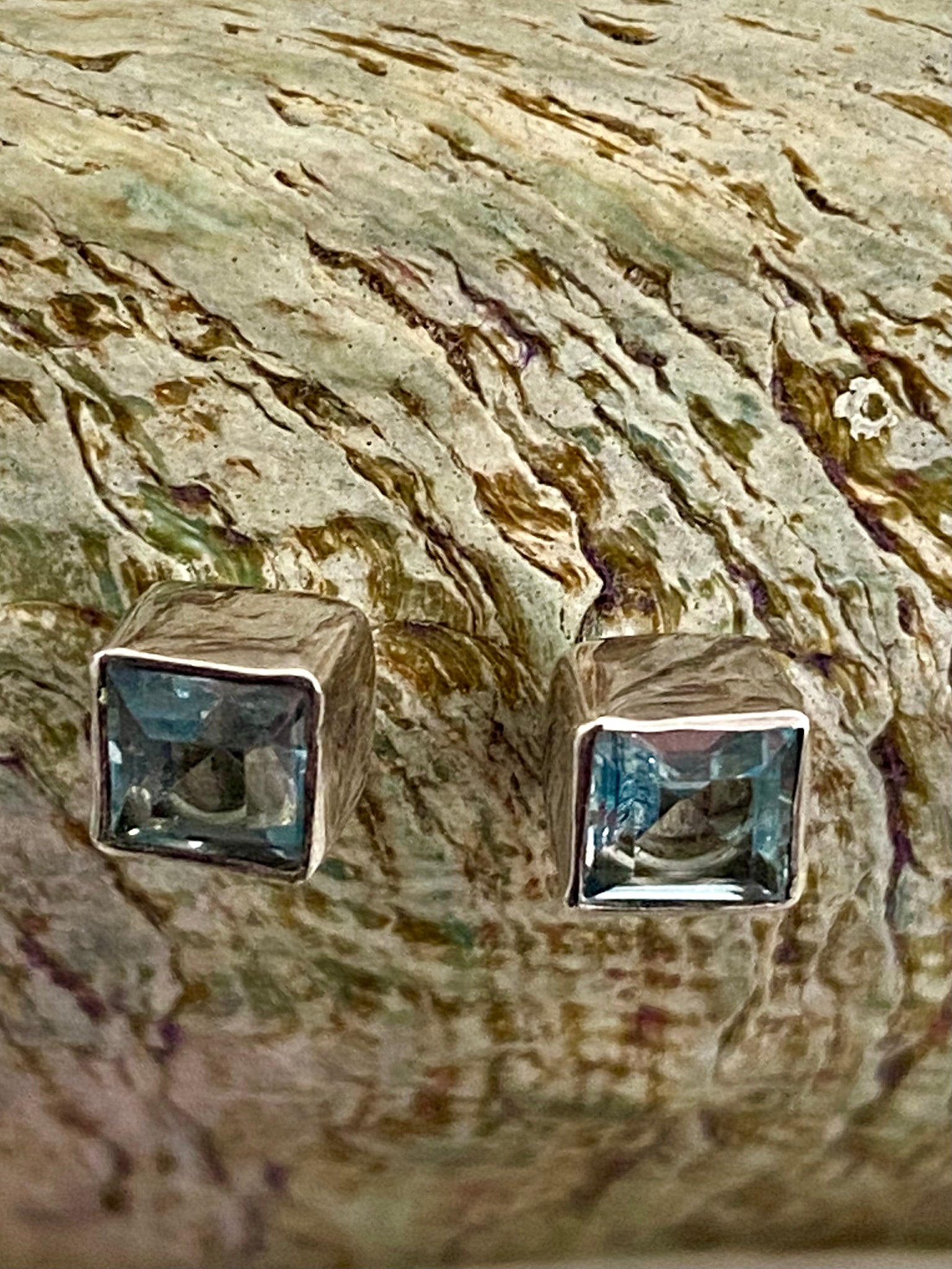 Blue Topaz sterling silver square stud earrings close-up – Merchant of Venus Jewellery